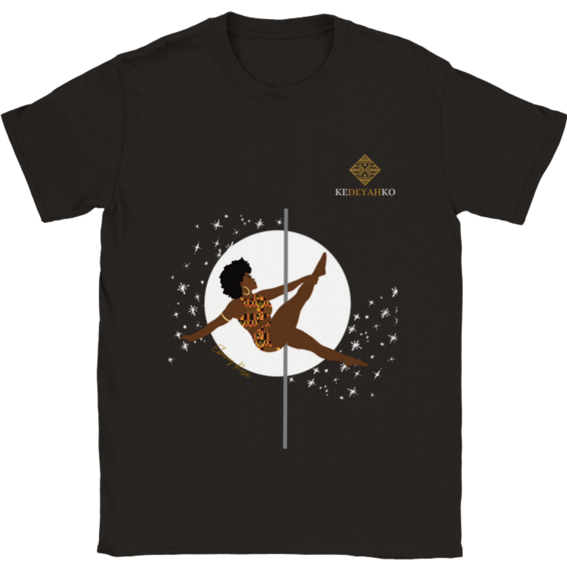 Each t-shirt celebrates empowered femininity and cultural pride, showcasing our stunning melanin kween pole dancer adorned in our signature Afrocentric Blaze design, making them the perfect match for your Blaze polewear.